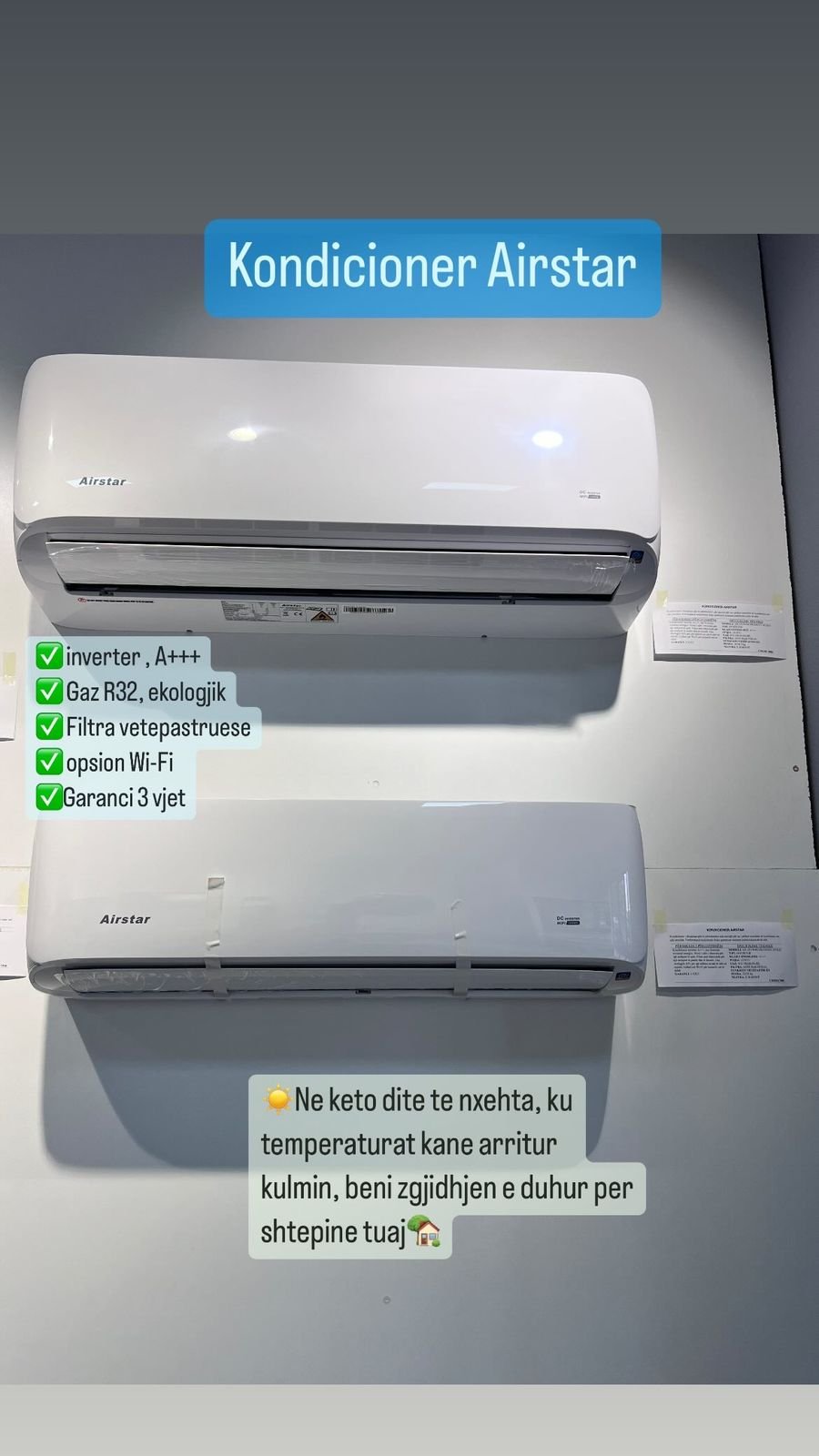 Blini sot kondicionerin Airstar dhe përfitoni montim falas në të gjithë Shqipërinë, direkt nga ekipi ynë profesional i Cibaku Group. Për më tepër, produkti ofrohet me garanci 3-vjeçare, duke ju dhënë siguri për investimin tuaj.