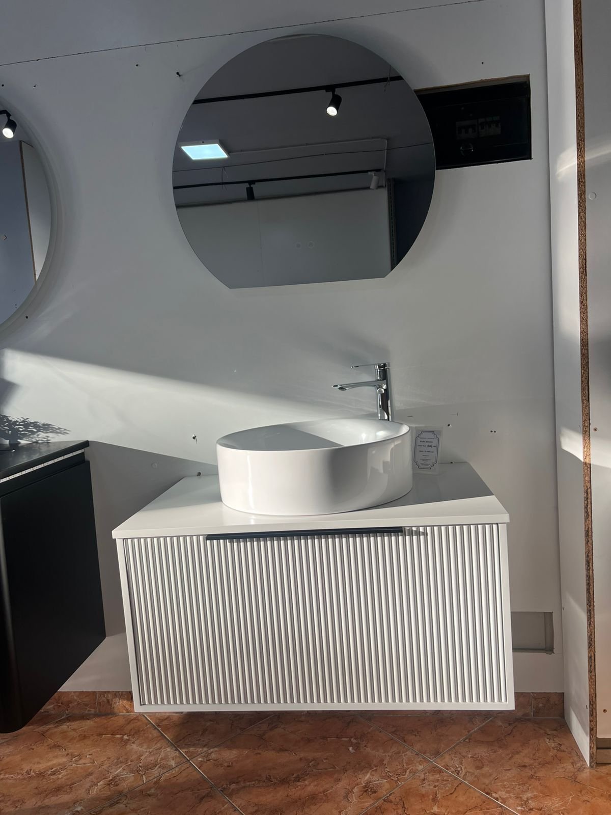 Pasqyra e madhe me me forme te vecante i jep thellësi ambientit dhe reflekton dritën në mënyrë perfekte.