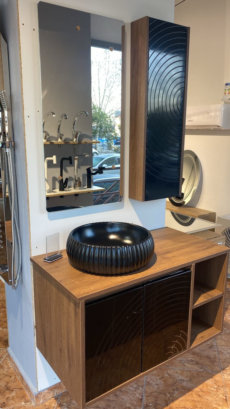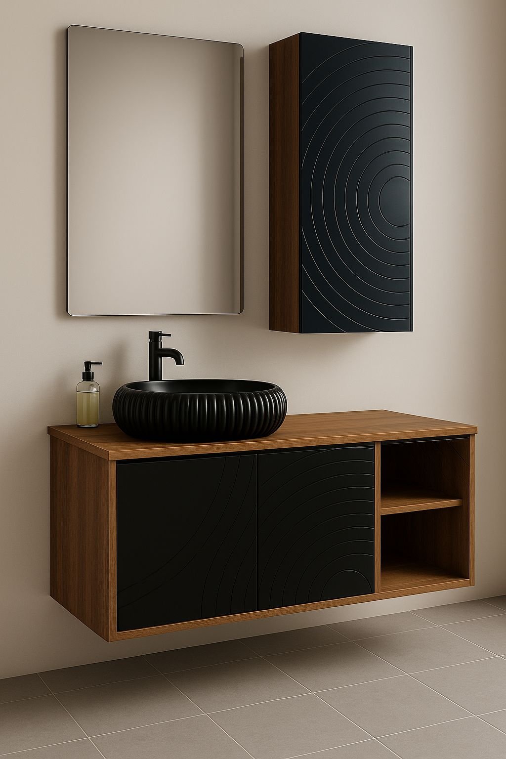 🛒 Bëje këtë mobilje lavamani me lavaman të zi pjesë të banjos tënde sot – për një hapësirë elegante, të organizuar dhe plot karakter.
